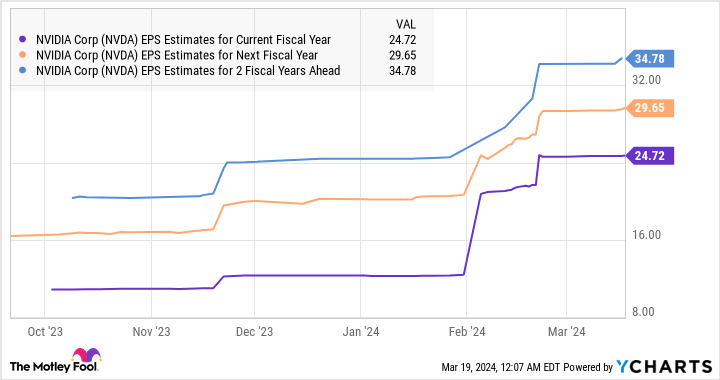 What’s even more impressive about Nvidia is that the chipmaker’s outstanding growth is probably here to stay. Its revenue guidance of $24 billion for the first quarter of fiscal 2025 means that Nvidia’s revenue is on track to more than triple once again from the year-ago period’s level of $7.2 billion. Analysts have been quick to raise their growth estimates. They expect Nvidia’s earnings to nearly triple in the space of just three fiscal years from fiscal 2024 levels of $12.96 per share.
